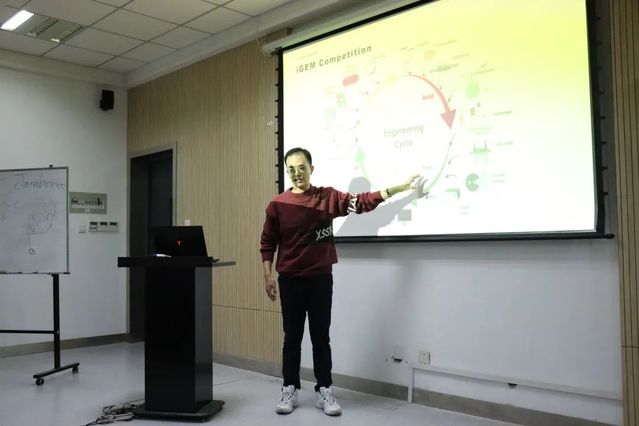 宣讲会开始,蒋震结合自身参赛体会,向同学们介绍了iGEM竞赛的宗旨等基本信息。他强调,iGEM主办方鼓励参赛团队通过解决日常问题来推动合成生物学的发展和应用,并为参赛团队展示自我成果搭建了一个国际舞台。每年比赛结束后,主办方仍然鼓励参赛者继续关注合成生物学的发展并为之努力。蒋震还对比赛流程以及评分标准等内容做了简要说明,让同学们对iGEM有了更加全面的了解。