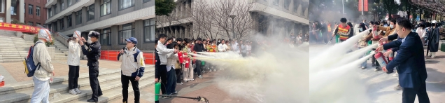 随后,校保卫处防火综治科闫勇老师给大家讲解了相关安全知识及火灾突发的应对措施,王俊程老师给全体师生详细介绍了灭火器的种类和防毒面具的使用方法,并邀请部分同学上前体验。师生员工还在现场分批次进行了灭火实战化演练,学习干粉和水基两种灭火器的使用和扑灭初起火灾的方法,大家纷纷踊跃参加。