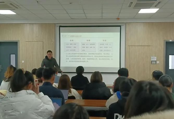 花城老师指出起草公文的要点在于根据具体事项使用正确的公文文种,同时在行文中把握文章主旨、注意逻辑关系、准确描述事实、规范公文格式。他详细分析了公文标题、主送机关、正文等九个主体部分要素内容和结构上的要求,同时结合公文写作中常见的误区强调了通知类、请示类等类型的公文写作的规范及写作技巧。最后和同学们分享了公文写作相关参考资料。