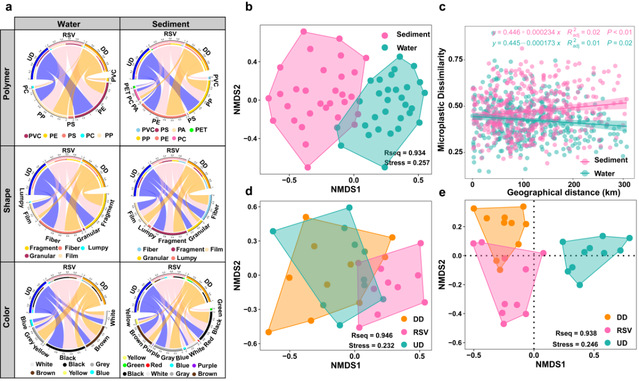 图2.不同大坝位置的微塑料(MPs)聚合物比例、形状和颜色(a)以及基于不同大坝位置MPs群落相似性的非度量多维尺度分析(NMDS)的结果(b)。水中和沉积物中MPs群落相似性的距离衰减关系被展示出来(c)。实线表示平均估计数,阴影部分表示95%的置信区间。根据NMDS,不同大坝位置的地表水(d)和沉积物(e)中的MPs群落差异显著。