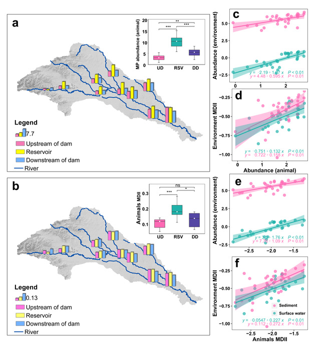 图3.动物体内MPs的平均丰度(a)和多样性综合指数(b)。不同介质中MPs平均丰度(c)和MDII值(d)与同物体内MPs丰度的相关性。动物MDII值与不同介质中MPs平均丰度(d)和MDII值(f)的关系。