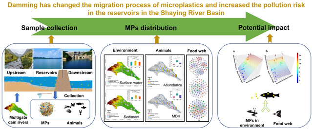 安树青教授团队长期从事河流湿地生态研究。该团队分析了典型多闸坝流域——沙颍河流域的10座大坝附近的水体、沉积物和生物组织中MPs的特征和丰度(图1),探讨大坝影响下的环境和动物体内MPs空间分布,揭示环境中MPs和食物网结构的变化对MPs在动物体内累积的影响,从而提出该类型流域中MPs暴露热点、迁移过程和潜在营养转移途径。