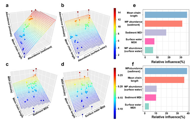 图4.动物MPs污染风险、平均链长和环境中MPs指标之间的关系。(a)和(b)分别显示地表水和沉积物MPs丰度与平均链长和动物体内MPs丰度之间的关系。(c)和(d)分别显示地表水和沉积物MDII值、平均链长和动物体内MDII之间的关系。聚类增强树(ABT)分析显示了环境中MPs指标和食物网结构对动物体内MPs丰度(e)和MDII(f)的影响。