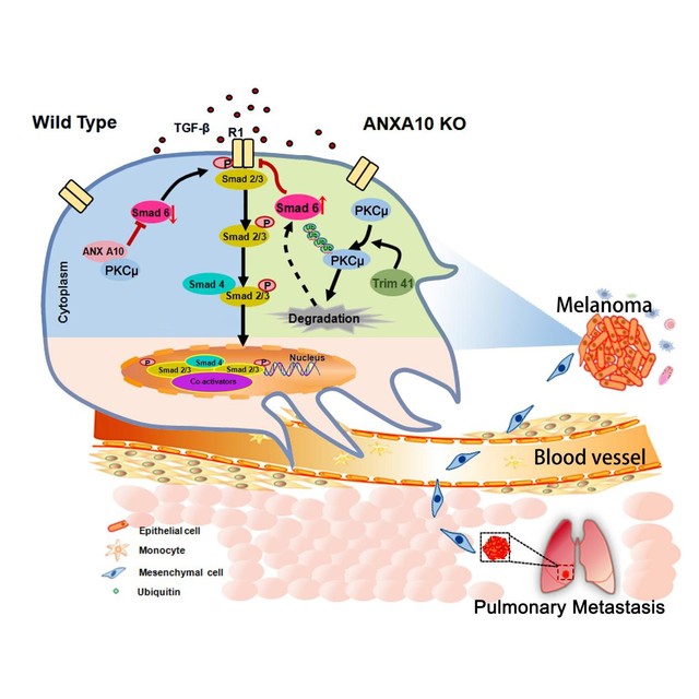 华子春教授课题组发现Annexin A10 在转移性黑色素瘤中高表达具有显著性差异,揭示了Annexin A10促进黑色素瘤转移的分子机制,论文发表在Cancer Letters (IF=8.679)上题为“ANXA10 promotes melanoma metastasis by suppressing E3 ligase TRIM41-directed PKD1 degradation”。研究表明,Annexin A10能结合PKD1并抑制PKD1的泛素化降解,进而调控下游靶分子Smad6表达水平,Smad6作为TGF信号通路重要的负调控因子,参与肿瘤细胞EMT的发生(图2)。通过黑色素瘤临床样本检测,ANXA10-PKD1-Smad6表达谱变化具有临床意义,与黑色素瘤恶性化程度密切相关。