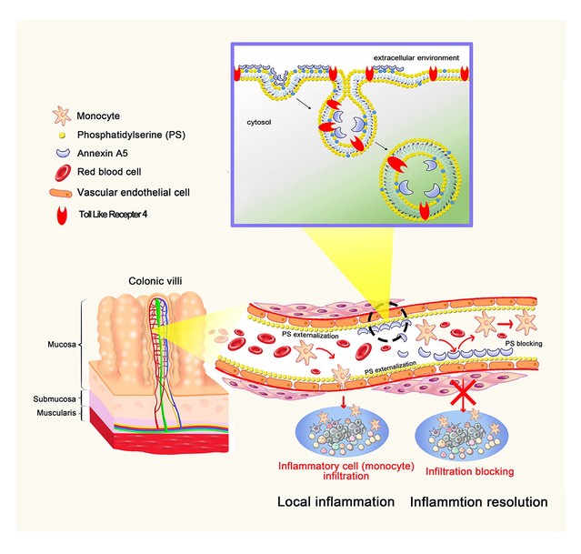 Annexin A5是一个常用的细胞凋亡检测蛋白分子,华子春教授课题组首次将Annexin A5应用于炎症性肠病(IBD)治疗,表现出很好的靶向性,有效缓解实验性结肠炎,论文在Signal Transduction and Targeted Therapy (IF=18.19)在线发表题为“Phosphatidylserine externalized on the colonic capillaries as a novel pharmacological target for IBD therapy”。炎症性肠病 (IBD) 是发病率快速增加的胃肠道的慢性复发性疾病,严重影响患者生活质量。靶向药物递送是一种有效治疗疾病且副作用最小的策略,鉴于肠粘膜的特殊环境,课题组大胆推测PS很可能是炎症性肠病的生物标志物、并可能成为Annexin A5治疗炎症性肠病的靶点。通过小鼠结肠炎模型验证,结肠毛细血管的内皮细胞确实存在大量PS外化的现象,Annexin A5通过与结合PS靶向富集到肠组织发挥抗炎作用。分子机制表明,Annexin A5与内皮细胞表面PS结合能触发 PS 依赖性的内吞作用,随之膜蛋白 TLR4发生内化阻断了内皮细胞激活,抑制了炎性细胞浸润(图1)。该研究为IBD治疗的靶向药物递送提供了新思路,并提出了Annexin A5 应用于IBD治疗潜在的临床价值。相关的新药研发工作进展顺利。