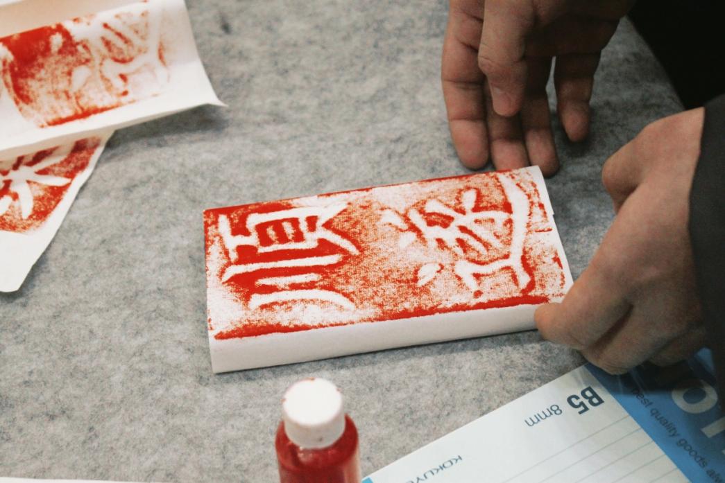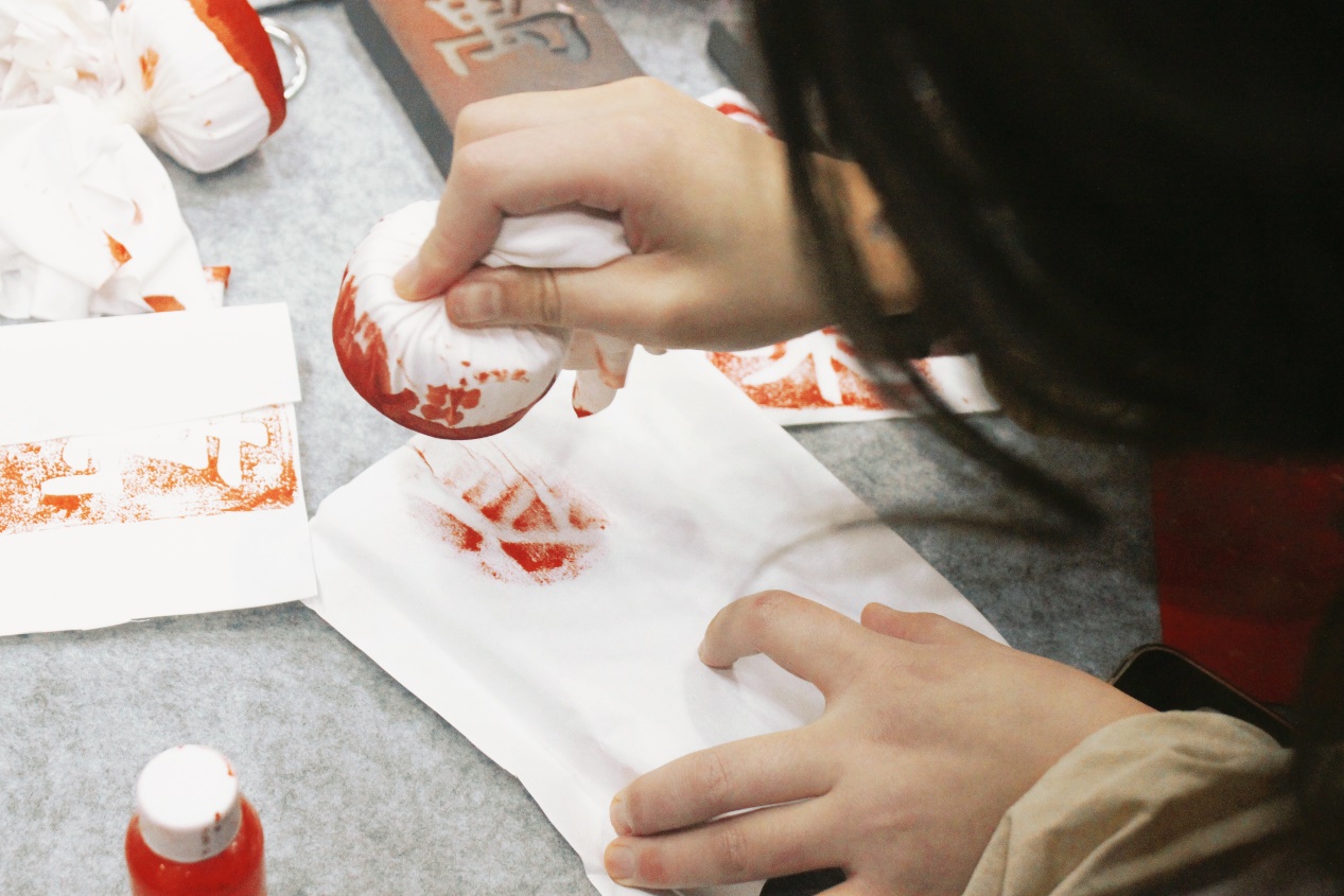 在拓印体验区,大家纷纷拿起拓包,小心翼翼地在样板上进行尝试,逐渐掌握了要点之后,一幅幅带着美好寓意的拓印作品逐渐呈现出来。