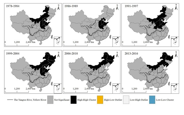 旱灾作为全球性的自然灾害之一,严重影响着人类的生存和社会的发展,如何有效的监测和预警,已经成为各国政府和学者亟待解决的问题之一。李建龙教授团队多年来通过对农牧业干旱灾害历史数据的分析,发现了农牧业干旱灾害在中国的发生、发展规律,并评估了农牧业旱灾发生的空间集聚性效应。目前,虽然已有众多学者将全局莫兰指数和区域莫兰指数应用于空间集聚性研究中,并取得了重要成果。然而,很少有研究涉及农牧业干旱灾害的空间集聚性问题及产生的效应。鉴于此,李建龙教授团队将空间集聚性概念与聚集度指数引入到农牧业干旱灾害定量评估研究中,并利用全局莫兰指数和区域莫兰指数对旱灾对我国农牧业生产影响进行空间集聚性分析以及进一步预警做出了创新性研究成果。他们的研究结果表明在1978-2016年间干旱灾害对中国农牧业生产具有明显的区域集聚性影响的特征(图1),具体反映在受灾面积的界定,其研究结果对未来干旱预警起到了一定的指示作用。他们的研究结果为今后分析干旱及旱灾对全球农牧业生产影响分析和灾害防治,提供了一定的科学依据及前瞻性研究指导。