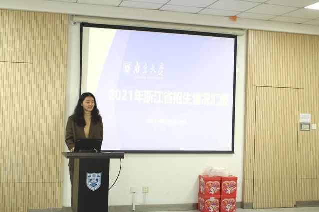 而后,浙江招生组副组长祝安琪老师对浙江2021年招生情况作了汇报。她向大家介绍了今年浙江省喜人的招生结果,并对新生的地域、年龄等数据作了趣味性的概括,既让大家对于新生的情况有了更加立体的了解,又展现了招生组浓厚的人文关怀,议程在欢快的氛围中继续推进。