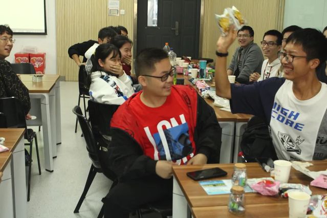 在以桌为单位轮流进行了自我介绍后,现场进行了猜词传声筒、你画我猜、击鼓传花等小游戏。此时大家已经熟络起来,笑点层出不穷。其中最有趣的当属方言传话,来自宁波、温州的同学纷纷“露一手”,造就了一份只属于浙江同学的欢乐时光,见面会也在热烈的氛围中走向了尾声。
