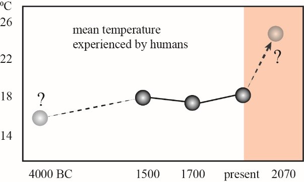 图1. 过去6000年来以及50年后全球平均人体环境温度(年均温)。问号表示人口分布重建数据以及未来气候模型具有不确定性