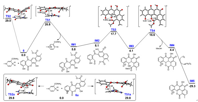 进一步,通过密度泛函理论计算对ChaE催化机理进行推测。首先在II型PKSs作用下遵循经典的蒽环霉素生物合成途径生成线性四环中间体4,由于受到C11位羟基影响,C13内酯羰基更容易被ChaE还原形成半缩醛的形式IM1,自发开环形成末端醛基IM2,环系翻转后自发缩合形成新的C-C键,随后自发的内酯化、氧化及芳构化形成五环的邻苯醌产物3。DFT计算表明,一旦半缩醛形成之后,后续的反应可以自发快速的进行(图-3)。