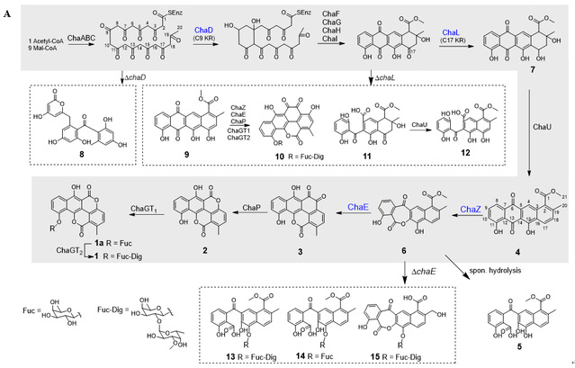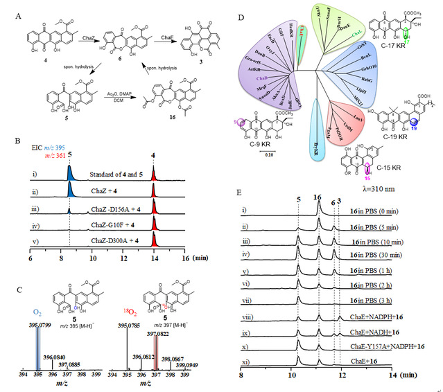 目前,该团队进一步研究揭示了由四环resomycin C(4)到五环的邻苯醌产物(3)仅需两个酶ChaZ和ChaE即可完成这一复杂的氧化重排过程。