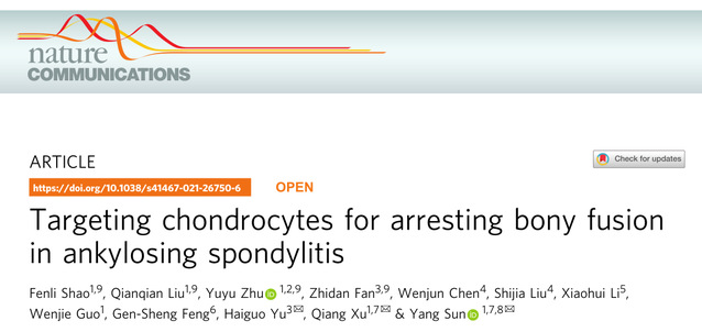 2021年11月11日,太阳成集团tyc33455cc孙洋/徐强团队和南京市儿童医院风湿免疫科俞海国团队联合在Nature Communications 上发表题为Targeting chondrocytes for arresting bony fusion in ankylosing spondylitis的研究论文(https://www.nature.com/articles/s41467-021-26750-6),提出异常软骨内骨化是强直性脊柱炎(AS)异位骨赘形成的直接原因,使用Smo抑制剂Sonidegib靶向软骨可显著阻止AS的骨融合进程。