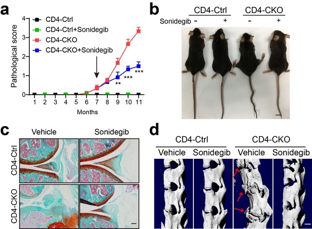 孙洋/徐强团队长期探究磷酸酶SHP2在炎症相关疾病中的生物学功能及其作为药物靶标的可行性(Nat Commun 2017; Acta Pharm Sin B 2019; J Biol Chem 2020; Signal Transduc Target Thera 2021; Arthritis Rheumatol 2021; Acta Pharm Sin B 2021)。一次偶然的机会研究人员发现CD4-Cre介导的SHP2条件性敲除小鼠在7月龄以上会出现脊柱、髋关节和骶髂关节等中轴关节变形与僵直症状。Micro-CT分析显示在7月龄后CD4-Cre;SHP2f/f(CD4-CKO)小鼠异位骨化形成骨赘逐渐充斥关节腔并铰链两端骨,导致关节僵直,小鼠12月龄时脊柱、骶髂关节、髋关节和膝关节等大关节均出现骨融合和关节僵直,小鼠活动艰难。