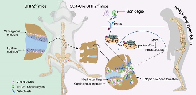 香港浸会大学中医药公司副经理、罗守辉骨与关节疾病转化医学研究所副所长、精准医学和创新药物研究所所长张戈教授评价道:长期以来,由于难以从患者脊柱关节获取组织,以及缺乏贴近临床表型的理想动物模型,强直性脊柱炎的发病机制研究举步维艰。近日,孙洋、徐强团队通过偶然发现的CD4-Cre条件性敲除SHP2的小鼠出现自发强直样表型(骨变形、骨赘、骨质疏松和骨融合),并以此小鼠为模型揭示了生长板闭合延迟是强直性脊柱炎发病的一种崭新机制,CD4-Cre条件性敲除SHP2的小鼠可作为一种新的探究强直性脊柱炎发病机制、干预靶标以及药物研发的理想实验动物模型。