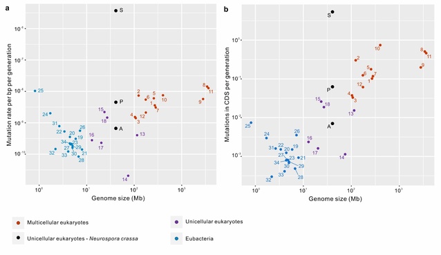 图2.脉孢菌有性生殖周期突变率的特殊性。目前为止对突变率的研究表明:(a)全基因组突变率与基因组大小在真细菌中呈现负相关、而在真核生物中呈现正相关关系;(b)编码区域的突变率与基因组大小在绝大多数物种中呈现正相关关系。在这几种关系中,脉孢菌有性周期的突变率(图中S所示)均显著偏离一般规律。