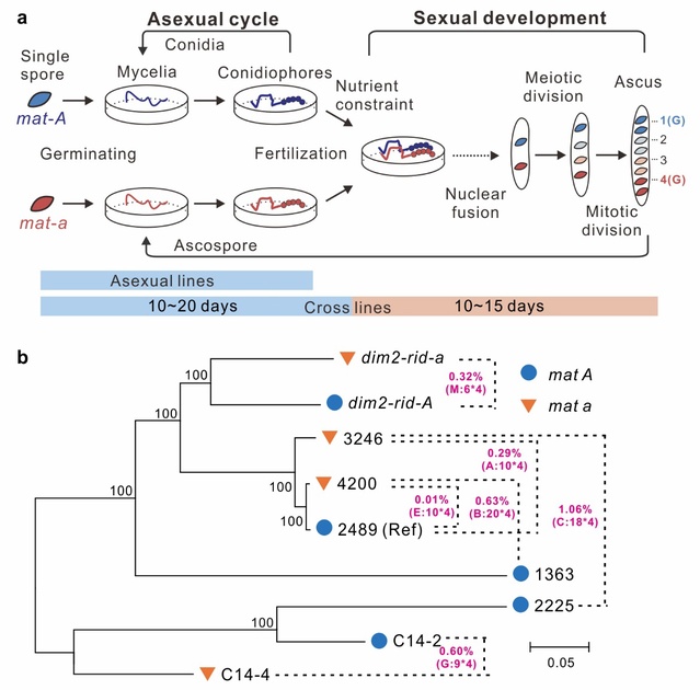 图1.实验设计与材料方案。(a)脉孢菌有性及无性周期示意图及取样策略;(b)选取的菌株遗传背景关系图。