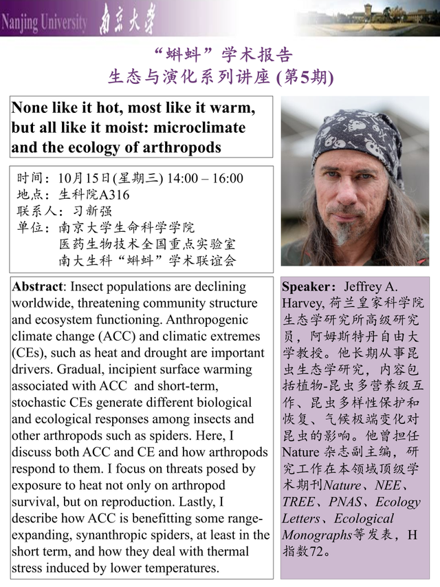 "蝌蚪”学术讲座:None like it hot, most like it warm, but all like it moist: microclimateand the ecology of arthropods