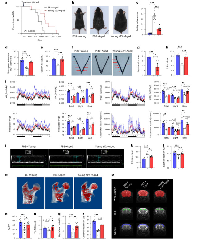 图 1. 注射年轻 sEVs对老年小鼠寿命和全身生理机能的长期影响。每周向老年雄性小鼠(20 个月)静脉注射一次 200 μl PBS 或年轻 sEVs(来源于2个月小鼠),并监测它们的存活时间或全身生理状况。年轻雄性小鼠(2 个月)同时注射 PBS 作为对照组。a、各组的 Kaplan-Meier 生存曲线。b、各组小鼠治疗 7 个月后的外观图像。c、治疗 4 个月后各组的平均虚弱指数评分。d-e、各组的精子计数和活力检测。f-g、与各组雄性小鼠交配的雌性小鼠子宫内可见蓝色带状植入点(胚胎)的数量。h、各组雄性小鼠所生后代的数量。i、各组小鼠氧气消耗量、二氧化碳释放量、产热量和运动频度。j-l、各组小鼠心脏尺寸和心功能指数的超声图。m-o、各组股骨近端小梁微结构的显微 CT 分析。p-r、基于 MRI 的各组海马体和皮层形态计量分析。