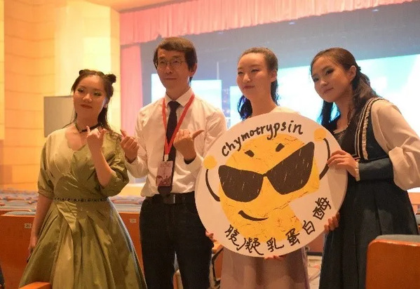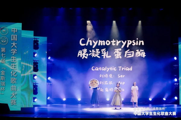 酶的高效性离不开环环相扣的奇妙催化机制,作为丝氨酸蛋白酶家族中的代表,胰凝乳蛋白酶是怎样被激活,又是如何催化反应的呢?Catalytic Triad组合的刘梓辰、刘品依、赵育梓三位同学分别代表活性中心的丝氨酸、天冬氨酸、组氨酸,作为催化三元体生动地演绎出催化过程,在《Chymotrypsin》中歌唱胰凝乳蛋白酶精彩纷呈的前世今生。作为第三个上场的队伍,Catalytic Triad组合顶住压力,凭借生化特色鲜明的英文歌词创作、熟练流畅的表演、出色的唱功赢得阵阵掌声,最终获得特等奖。