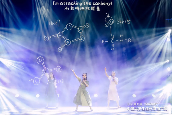 当DNA开始转录和翻译,脱氧核糖、核糖、氨基酸的排列组合暗藏着生命的密码。七十多年前,沃森和克里克等生物学家用论文和实验完善了生命的中心法则,带我们走进神秘的分子遗传学世界。生化歌曲的舞台上,在经典音乐剧《音乐之声》的旋律中,高效有序的分子世界和变化万千的音符乐谱就此结合,演奏出精彩绝伦的生命之歌。梨花带雨组合经过层层角逐,荣获特等奖和最佳英文单曲奖。