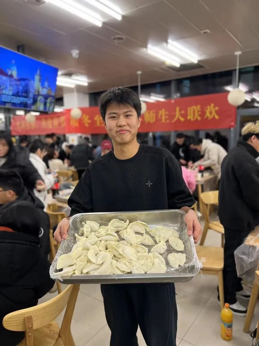 活动一开始,同学们就迫不及待得落座,将热情融入到包饺子中,一边和三五好友闲聊,一边手指飞速地捏动着饺子皮,不一会一盘盘各式各样的饺子就包好了。之前没有包过饺子的同学也在身边同学的指导下逐渐掌握技巧,也包出了精美的饺子。