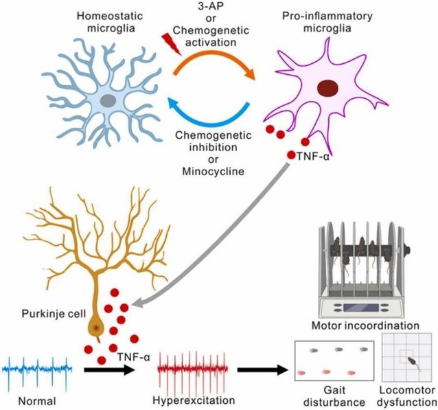 图1. 小脑小胶质细胞的促炎性激活过度兴奋浦肯野细胞导致共济失调。