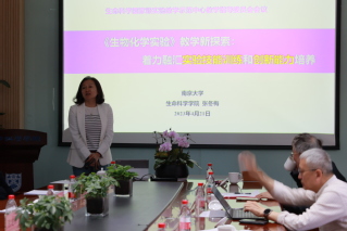 张冬梅对《生物化学实验》课程作了汇报,鉴于生物化学实验在多学科、多专业中“承上启下”的重要定位,该课程提出了应积极适应学科知识体系高速发展、学科深度交叉融合面临的新挑战,并从中阐明了南大生科在践行创新思维和综合能力培养的研究型教学中做出的积极探索,即按照“进阶式教学模式(课程内)、多层次课程设计(课程组)、科研融合研究型(导师制)、专业面向多元化(模块化)”实现课程资源持续建设、多专业需求灵活配置。她通过多年的教学实践,总结出学科持续建设工作应该从集百家所长、资源整合入手,把握课程核心使命与建设目标,不断探索培养员工实验技能与创新思维能力。