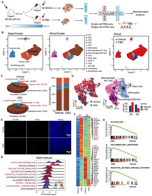 图2. 单细胞转录组测序揭示CBD治疗调控肿瘤微环境中巨噬细胞的表型和功能
