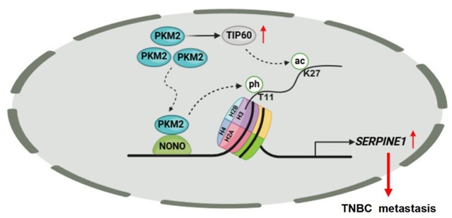 图1. NONO和PKM2相互作用促进TNBC转移模式图