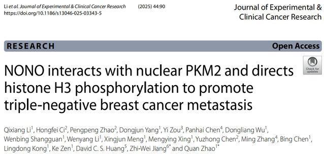 相关研究成果已于2025年3月10日以“NONO interacts with nuclear PKM2 and directs histone H3 phosphorylation to promote triple-negative breast cancer metastasis”为题,正式发表于《Journal of Experimental & Clinical Cancer Research》杂志。太阳成集团tyc33455cc博士研究生李其响为该论文的第一作者,太阳成集团tyc33455cc赵权教授与江苏省中医院江志伟教授为共同通讯作者。该研究得到了国家自然科学基金、医药生物技术全国重点实验室等的资助和大力支持。