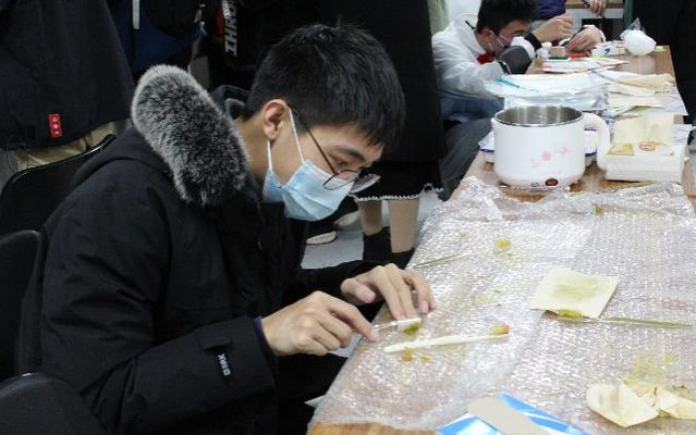 结束了标本室的参观,活动进入了趣味横生的游戏与抽奖环节。在小游戏“叶脉书签”的展台旁,同学们小心地将树叶上的叶肉刷去,留下叶脉部分,再用塑料薄膜压平,密封,最后剪出轮廓就得到了一张精美的叶脉书签。小游戏“封面人物”与“博物学家”也颇受同学们的欢迎。参与完游戏,同学们用开放日所收集的印章拼手气抽取奖品,欢笑连连。