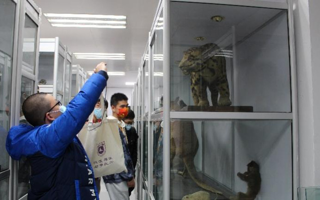 参观完实验室之后,同学们来到了一楼的标本室。标本室中所陈列的标本小到珊瑚、贝壳,大到白暨豚,云豹,时间可从上世纪末追溯到建系之初,体现了百年生科的悠久历史。标本室内,志愿者为同学们讲解了标本背后所蕴含的生物学知识。看着一件件精美的标本,同学们不仅惊叹于大自然的生命魅力,更感受到了百年生科的学术传承。