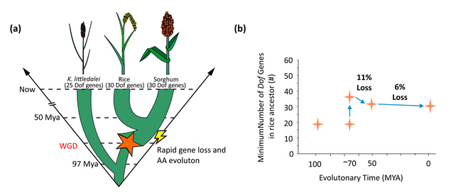 在这三篇文章中,该课题组围绕着遗传与进化生物学的最根本的问题,基因组突变与重组,以水稻和柳树为材料,利用高通量测序技术,准确的检测了水稻与柳树的体细胞分裂突变率及重组率,揭示了体细胞变异对植物遗传多样性的潜在贡献;通过以Dof基因家族作为案例,进一步评估了遗传变异对该基因家族功能演化的重要影响。相关工作得出了以下重要结论:(1)第一次在植物中系统的评估了有丝分裂基因转换的频率和规律(图1),发现同酵母有丝分裂一样,植物有丝分裂同样存在长片段的基因转换事件(>50kb);(2)揭示了植物中有丝分裂过程中的基因转换事件对植物遗传多样性演化的贡献不亚于减数分裂基因转换事件;(3)发现植物中存在非常早期的细胞家系隔离现象(图2),影响了不同分生组织细胞家系中体细胞突变积累的情况,进而影响了体细胞突变在后代中的遗传;(4)发现植物产生的不定根来源于单个干细胞,而叶片等器官则来源于多个干细胞;(5)系统追踪了Dof基因家族在水稻、高粱和蒿草中的演化过程(图3),发现在全基因组复制事件之后,Dof基因会快速积累遗传变异,并在之后长时间保持稳定。