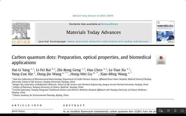 该综述于2023年4月22日以“Carbon quantum dots: Preparation, optical properties, and biomedical applications”为题发表在Materials Today Advances期刊上,(文章下载链接:https://authors.elsevier.com/sd/article/S259004982300036X)。