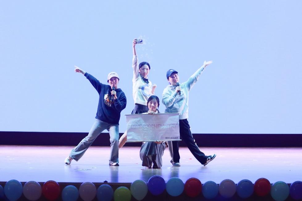 Q循环是呼吸链中复合体Ⅲ借助辅酶Q的电子传递方式,在线粒体内膜中电子传递链上两个QH2分别传递一个电子到细胞色素c中,即共使2个细胞色素c得到电子,从而被还原。在此过程中,电子的来源、流动过程和去向是生化学习的重点和难点。CoQ派组合根据“循环”的特点,对经典的英文歌曲《Call me maybe》进行改编,以玫瑰花代指电子,以少年对少女的追求、献出玫瑰花的过程生动形象地阐释电子的传递过程,使这一过程变得简单易懂、便于记忆。同时在歌曲的编排中加入一系列的互动剧情及舞蹈设计,在表演中展现老员工的青春风采,让生化知识的传递过程变得有趣而生动,展现生化之美。最终,CoQ派组合在层层角逐中荣获一等奖。