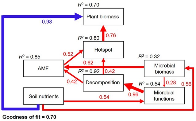 结构方程模型分析表明,快速的凋落物分解和扩大的酶活性热点区域面积促进了植物的生长(图3)。具体来说,AMF通过增加腐生菌的生物量和酶活性加速凋落物的矿化。同时,腐生菌增加了AMF对根的定殖率,进一步扩大了根际酶活性热点区域面积以增加根际周围的养分供给。