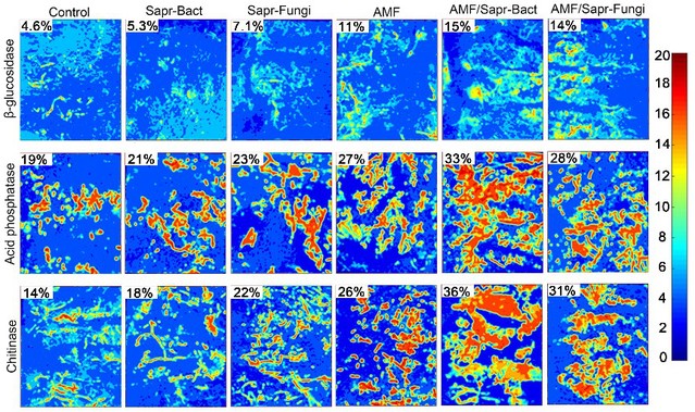 该团队设计了一个适用于原位土壤酶谱技术的新型分室微宇宙实验(图1),研究在养分丰富和贫瘠土壤条件下,腐生菌和AMF互作对紫花苜蓿凋落物分解和根际酶活性空间分布的影响。在养分贫瘠的土壤中,与单一细菌或真菌接种相比,腐生细菌和真菌与AMF的共接种均加速了凋落物的分解,同时扩大了根际酶活性热点区域的面积(图2)。腐生细菌与AMF的这种协同作用在养分贫瘠的土壤中比在养分丰富的土壤中表现的更强。腐生真菌与AMF在营养丰富的土壤中甚至抑制了凋落物分解。