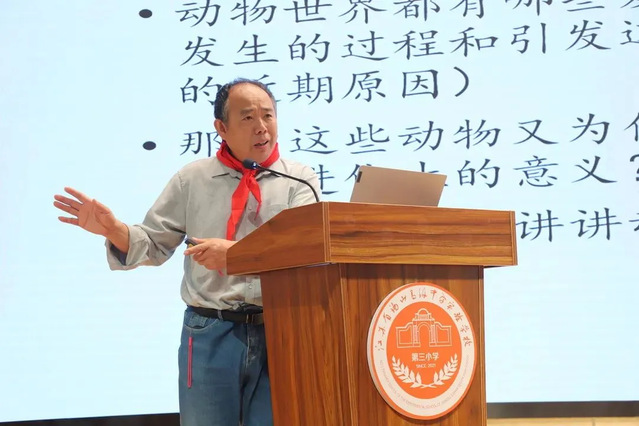 下午,省锡实三小在报告厅举办了“童心时光联盟”校外辅导员聘任仪式,张太平、朱爱武、黄成三位老师受聘。随后,黄成老师以“解读动物世界的爱美与臭美”为题展开讲座,风趣幽默地介绍动物爱美行为的几类方式及其进化上的适应性,动物的臭美行为则由孩子们发挥奇思妙想,现场气氛热烈,师生互动积极。