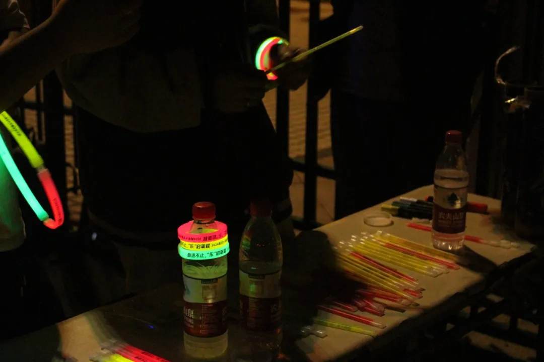 跑道外、展台上,来自太阳成集团tyc33455cc员工会的工作人员们以及志愿者们在为这次活动保驾护航。入口处华丽的展板,手腕上跃动的荧光,背景律动的音乐,以及在打卡点时刻为大家提供帮助的志愿者......凉爽的晚风与动人的旋律,吸引了更多同学的加入。