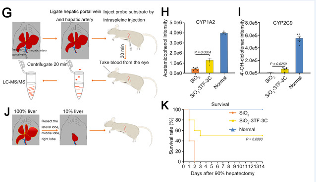 在该项最新研究中,研究团队首先将脾脏从腹腔移位到皮下,方便对脾脏的连续注射和观察,再对脾脏注射二氧化硅(SiO2)纳米颗粒,促进脾脏内成纤维细胞的增殖,为后续的重编程和肝再生奠定基础。接下来,研究团队使用慢病毒作为递送载体,让脾脏细胞过表达肝脏特异性的转录因子(Foxa3、Gata4和Hnf1a),使脾脏成纤维细胞原位转分化为有功能的肝细胞。最后,通过对脾脏输送肿瘤坏死因子-α(TNF-α)蛋白和过表达表皮生长因子(EGF)和肝细胞生长因子(HGF)的慢病毒,进一步促进脾内转分化肝细胞的增殖。转化后的脾脏内肝细胞的数量达到了8×106个,而且能够稳定存在长达6个月的时间,并具有典型的肝脏生理功能(图1)。