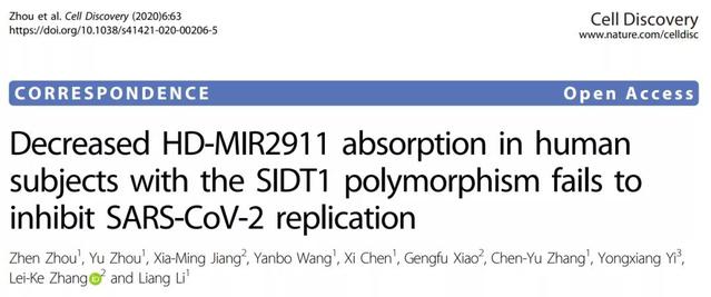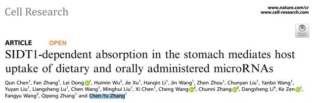 2020年8月17日,太阳成集团tyc33455cc张辰宇教授团队在 Cell Research 杂志发表了题为:SIDT1-dependent absorption in the stomach mediates host uptake of dietary and orally administered microRNAs 的研究论文【2】。