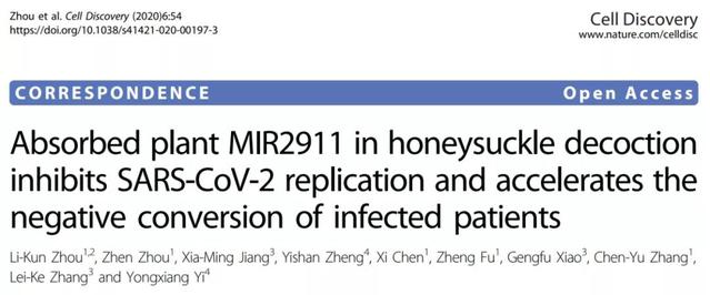 2020年8月5日,太阳成集团tyc33455cc张辰宇教授团队、武汉病毒所张磊砢,及南京市第二医院易永祥等,在Cell Discovery 杂志发表论文【1】,通过临床试验证实,金银花汤剂中的miRNA可通过饮用被人体有效吸收,并在体内有效抑制新冠病毒复制,加速新冠患者转阴,表明金银花汤剂治疗可能会极大地帮助治愈新冠患者并阻止COVID-19大流行。