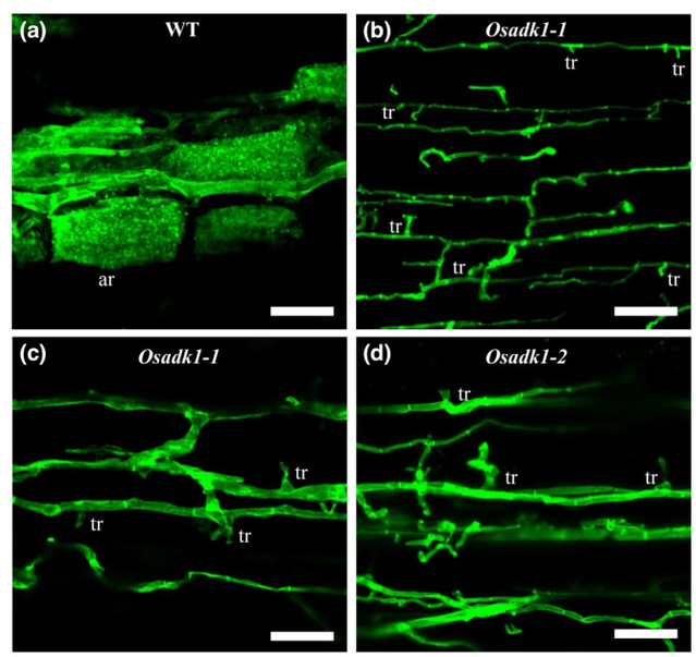 王斌教授课题组发现在水稻建立AM共生过程中,OsADK1在形成丛枝的细胞中特异诱导表达。通过CRISPR/Cas9技术得到敲除该基因的突变体。与野生型相比,Osadk1突变体的定植率显著降低。更为重要的是,在突变体根中观察不到充满整个细胞的正常丛枝,真菌菌丝进入皮层细胞后丛枝发育停留在trunk阶段,没有继续分化,暗示植物调控真菌丛枝的发育过程在早期阶段就被终止。