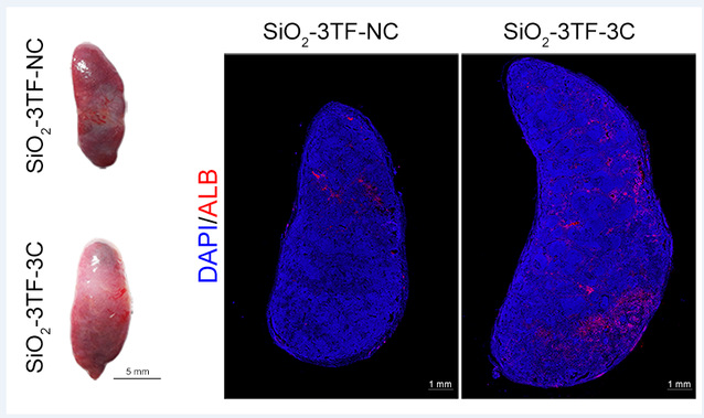在该项最新研究中,研究团队首先将脾脏从腹腔移位到皮下,方便对脾脏的连续注射和观察,再对脾脏注射二氧化硅(SiO2)纳米颗粒,促进脾脏内成纤维细胞的增殖,为后续的重编程和肝再生奠定基础。接下来,研究团队使用慢病毒作为递送载体,让脾脏细胞过表达肝脏特异性的转录因子(Foxa3、Gata4和Hnf1a),使脾脏成纤维细胞原位转分化为有功能的肝细胞。最后,通过对脾脏输送肿瘤坏死因子-α(TNF-α)蛋白和过表达表皮生长因子(EGF)和肝细胞生长因子(HGF)的慢病毒,进一步促进脾内转分化肝细胞的增殖。转化后的脾脏内肝细胞的数量达到了8×106个,而且能够稳定存在长达6个月的时间,并具有典型的肝脏生理功能(图1)。