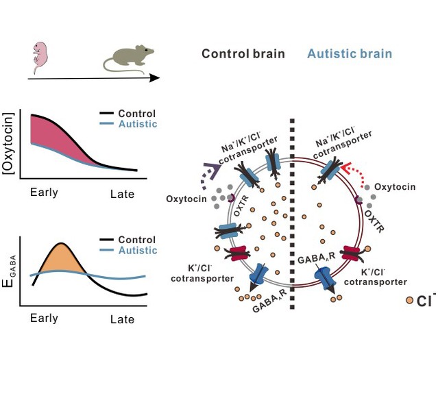 值得注意的是,这一发现与丙戊酸诱导和Fmr1基因敲除的两种经典ASD模型小鼠脑中缩宫素水平仅在出生后发育早期(出生后第1周)异常降低,而在发育晚期及成年阶段均无显著变化的现象相一致。进一步研究揭示,发育早期的缩宫素缺乏与ASD模型小鼠出生后的GABA极性转换障碍相关。在神经系统发育早期,GABA能信号会经历从兴奋性效应到抑制性效应的极性转换,这一过程对神经系统结构与功能的正常发育至关重要。然而,出生后早期,ASD模型小鼠的GABAA受体逆转电位较正常小鼠的GABAA受体逆转电位更负,并伴有Na+-K+-2Cl-共转运体(NKCC1)的表达下调(影响Cl-平衡电位)。若在该关键期内进行缩宫素干预,不仅可以恢复NKCC1表达和GABAA受体逆转电位,还能显著改善模型动物的孤独症样行为。然而,若错过此窗口期,在发育晚期进行缩宫素干预则不能产生改善效应。