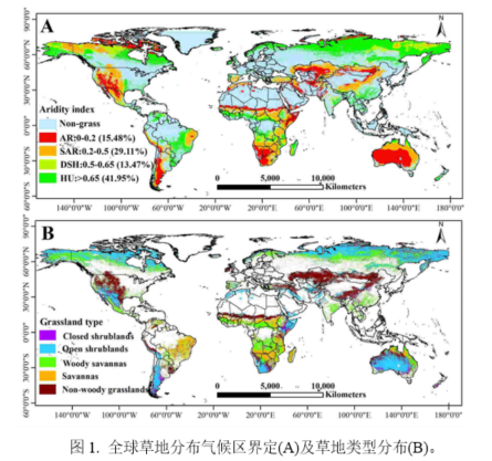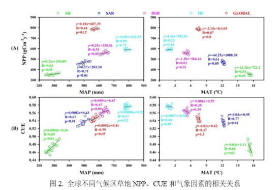 为了准确探究全球尺度下不同干旱梯度(气候区)下草地净初级生产力(NPP)及其碳利用效率(CUE)的动态趋势,并科学揭示不同气候区草地NPP和CUE对气候变化的响应机制,该团队基于全球植被生产力数据、气温降水数据、潜在蒸散量数据以及草地覆被数据,将全球草地分布区细分为干旱(AR)、半干旱(SAR)、半湿润(DSH)和湿润(HU)四个干旱梯度(气候区)(图1),并通过趋势分析法准确反应该时间段不同干旱梯度草地NPP和CUE的时空演变动态,在此基础上精确评估不同气候区草地NPP和CUE对气候变化的响应机制。