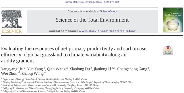 该成果以“Evaluating the responses of net primary productivity and carbon use efficiency of global grassland to climate variability along an aridity gradient” (https://www.sciencedirect.com/science/article/pii/S0048969718341913?dgcid=author)为题在生态环境顶级杂志《Science of the Total Environment》发表,第一作者为2017级博士研究生刘洋洋,通讯作者为李建龙教授。