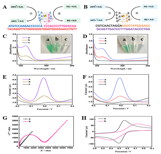 在本研究中,如图1所示。首先,乳腺癌来源的外泌体被修饰CD63适体的磁珠捕获。随后,将针对PD-L1或MUC1蛋白的适体加入体系中。适体能够通过特异性识别并结合外泌体上的PD-L1或MUC1蛋白,未被结合的适体通过磁分离收集到离心管中并分别加入含有三个-GGG-重复片段和单个-GGG-重复片段且与适体一半配对的核苷酸序列。两段核苷酸在不存在适体的情况下保持分离,但在存在适体的情况下可以接近折叠成G4结构,不仅可以催化2,2'-联氮-双-3-乙基苯并噻唑啉-6-磺酸(ABTS)的氧化,产生比色信号,还可以组装到电极上,催化对苯二酚(HQ)氧化,产生电化学信号,实现外泌体表面蛋白的双模式检测。与其他传感器相比,该传感器优势明显:(1)双模式传感器可以彼此对照,展示各自的优势,实现对外泌体表面蛋白的精准检测。(2)操作简单,背景信号低,有利于开发便携式传感器。(3)不需要使用商品化氧化酶,也不需要标记,节约了成本。(4)通过改变适体和对应的撕裂DNAzyme探针,可以用于多种外泌体膜蛋白分析。