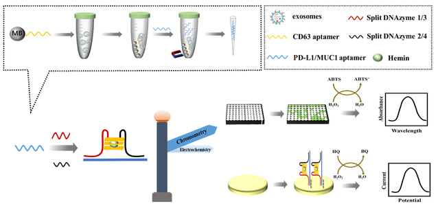 图1.基于不对称撕裂DNAzyme的乳腺癌外泌体蛋白双模式检测平台示意图